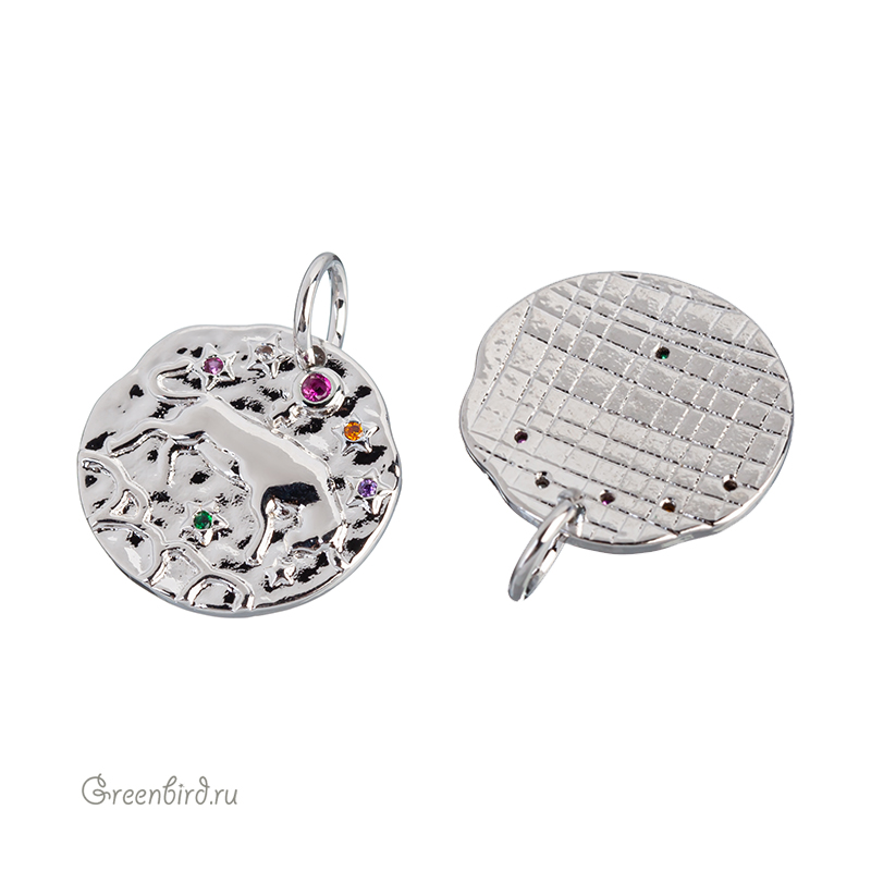 Фурнитура для бижутерии - подвеска односторонняя с зодиакальным символом, украшенная фианитами, с разъемным кольцом. Материал: латунь, покрытие: родий. Цвета фианитов: сиреневый, розовый, оранжевый, зеленый. Размер: 15 х 14,8 мм, толщина: 1,7 мм, кольцо: 5,8 мм, толщина проволоки: 0,9 мм, общая высота: 18,6 мм. Обратите внимание: в зависимости от партии покрытие может быть глянцевым или более матовым. Возможны наплывы покрытия на фианиты. Производство: Китай. Цена указана за 1 шт.
