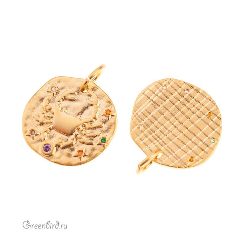 Фурнитура для бижутерии - подвеска односторонняя с зодиакальным символом, украшенная фианитами, с разъемным кольцом. Материал: латунь, покрытие: золото. Цвета фианитов: сиреневый, оранжевый, зеленый, хрусталь. Размер: 15,1 х 14,6 мм, толщина: 1,9 мм, кольцо: 5,6 мм, толщина проволоки: 0,9 мм, общая высота: 18,1 мм. Обратите внимание: в зависимости от партии покрытие может быть глянцевым или более матовым. Возможны наплывы покрытия на фианиты. Производство: Китай. Цена указана за 1 шт.