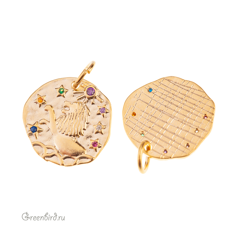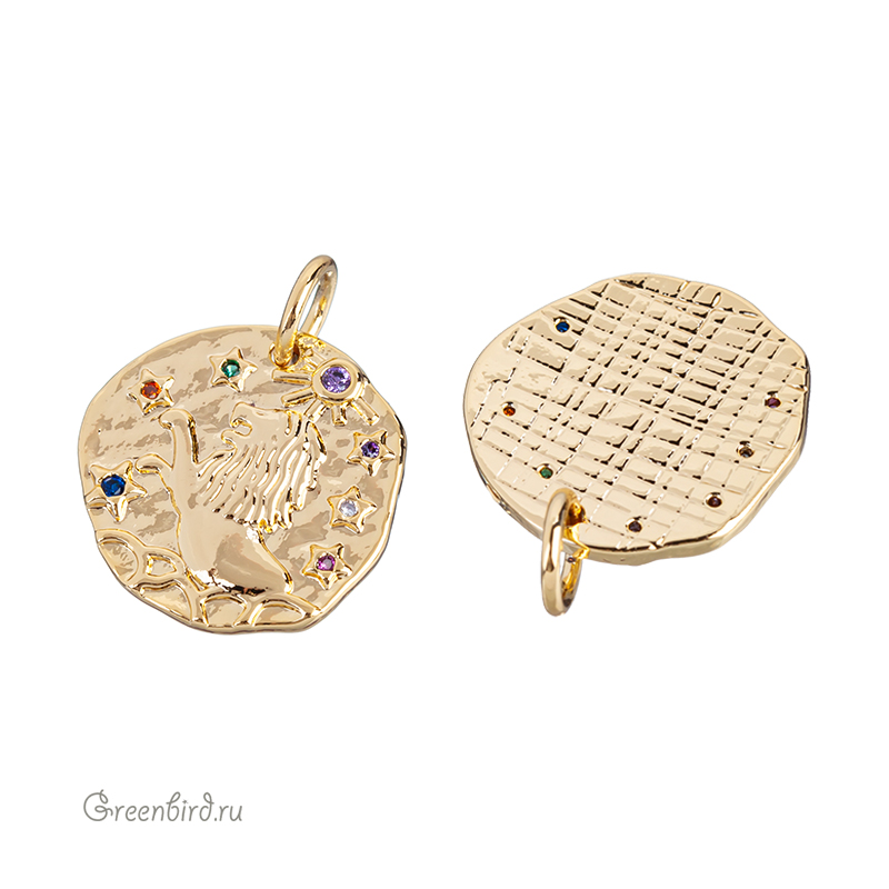 Фурнитура для бижутерии - подвеска односторонняя с зодиакальным символом, украшенная фианитами, с разъемным кольцом. Материал: латунь, покрытие: золото. Цвета фианитов: сиреневый, синий, оранжевый, красный, зеленый, хрусталь. Размер: 15,4 х 15,1 мм, толщина: 1,6 мм, кольцо: 5,6 мм, толщина проволоки: 0,9 мм, общая высота: 19 мм. Обратите внимание: в зависимости от партии покрытие может быть глянцевым или более матовым. Возможны наплывы покрытия на фианиты. Производство: Китай. Цена указана за 1 шт.