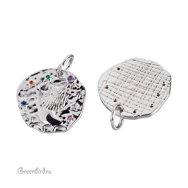 Фурнитура для бижутерии - подвеска односторонняя с зодиакальным символом, украшенная фианитами, с разъемным кольцом. Материал: латунь, покрытие: родий. Цвета фианитов: сиреневый, синий, оранжевый, красный, зеленый, хрусталь. Размер: 15,4 х 15,1 мм, толщина: 1,6 мм, кольцо: 5,6 мм, толщина проволоки: 0,9 мм, общая высота: 19 мм. Обратите внимание: в зависимости от партии покрытие может быть глянцевым или более матовым. Возможны наплывы покрытия на фианиты. Производство: Китай. Цена указана за 1 шт.