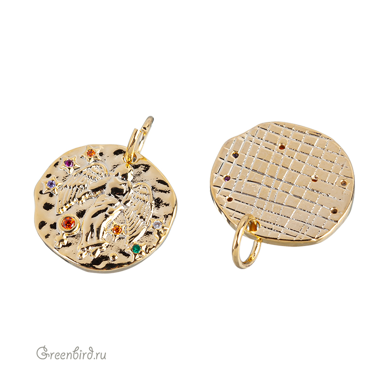 Фурнитура для бижутерии - подвеска односторонняя с зодиакальным символом, украшенная фианитами, с разъемным кольцом. Материал: латунь, покрытие: золото. Цвета фианитов: сиреневый, розовый, оранжевый, зеленый, хрусталь. Размер: 15,3 х 14,5 мм, толщина: 1,8 мм, кольцо: 5,7 мм, толщина проволоки: 0,9 мм, общая высота: 18,8 мм. Обратите внимание: в зависимости от партии покрытие может быть глянцевым или более матовым. Возможны наплывы покрытия на фианиты. Производство: Китай. Цена указана за 1 шт.