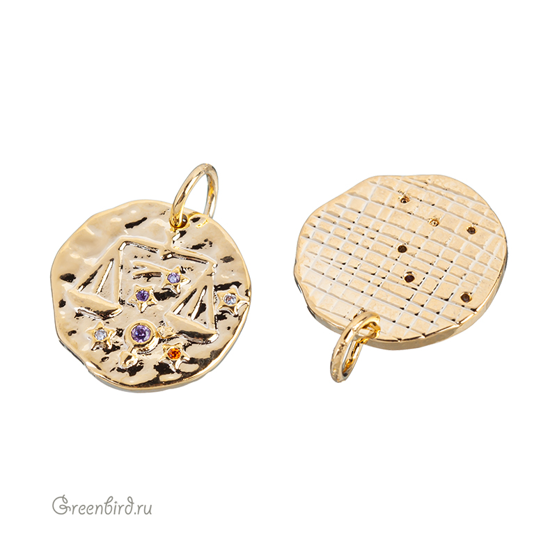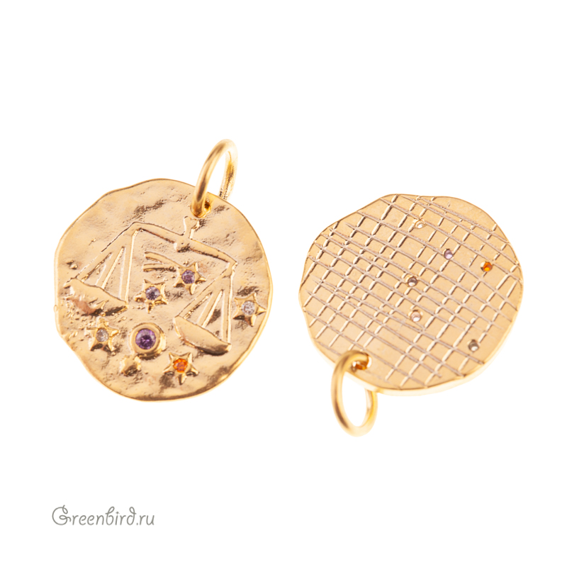 Фурнитура для бижутерии - подвеска односторонняя с зодиакальным символом, украшенная фианитами, с разъемным кольцом. Материал: латунь, покрытие: золото. Цвета фианитов: сиреневый, оранжевый, хрусталь. Размер: 14,8 х 14,8 мм, толщина: 2 мм, кольцо: 5,7 мм, толщина проволоки: 0,9 мм, общая высота: 18,6 мм. Обратите внимание: в зависимости от партии покрытие может быть глянцевым или более матовым. Возможны наплывы покрытия на фианиты. Производство: Китай. Цена указана за 1 шт.