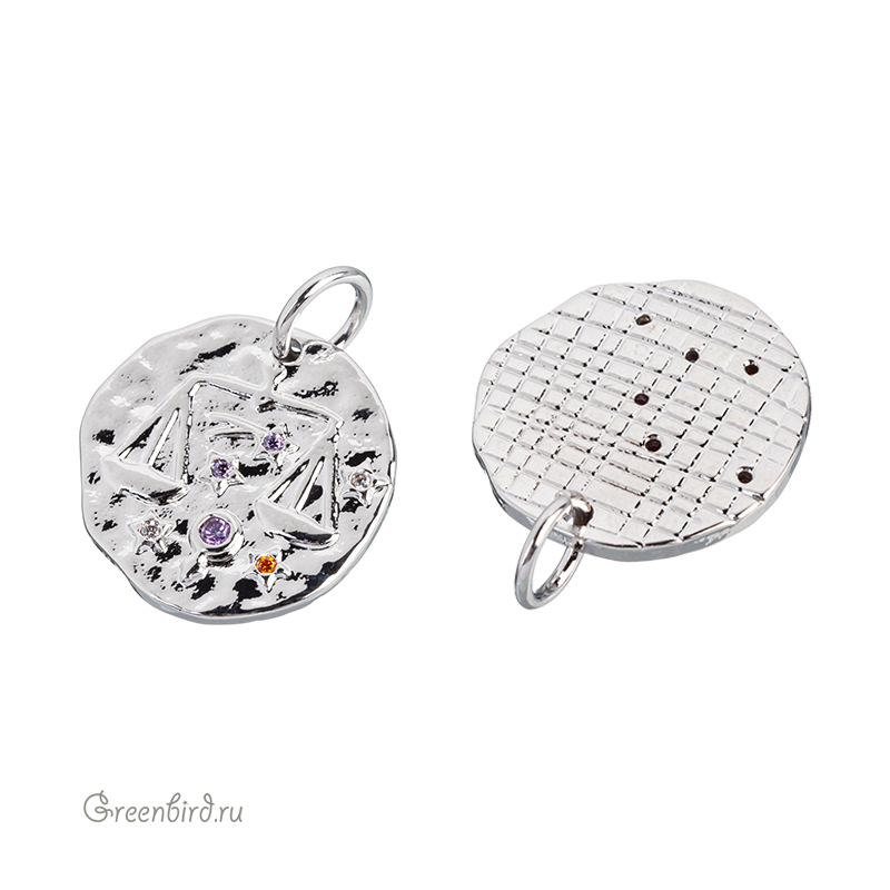 Фурнитура для бижутерии - подвеска односторонняя с зодиакальным символом, украшенная фианитами, с разъемным кольцом. Материал: латунь, покрытие: родий. Цвета фианитов: сиреневый, оранжевый, хрусталь. Размер: 14,8 х 14,8 мм, толщина: 2 мм, кольцо: 5,7 мм, толщина проволоки: 0,9 мм, общая высота: 18,6 мм. Обратите внимание: в зависимости от партии покрытие может быть глянцевым или более матовым. Возможны наплывы покрытия на фианиты. Производство: Китай. Цена указана за 1 шт.