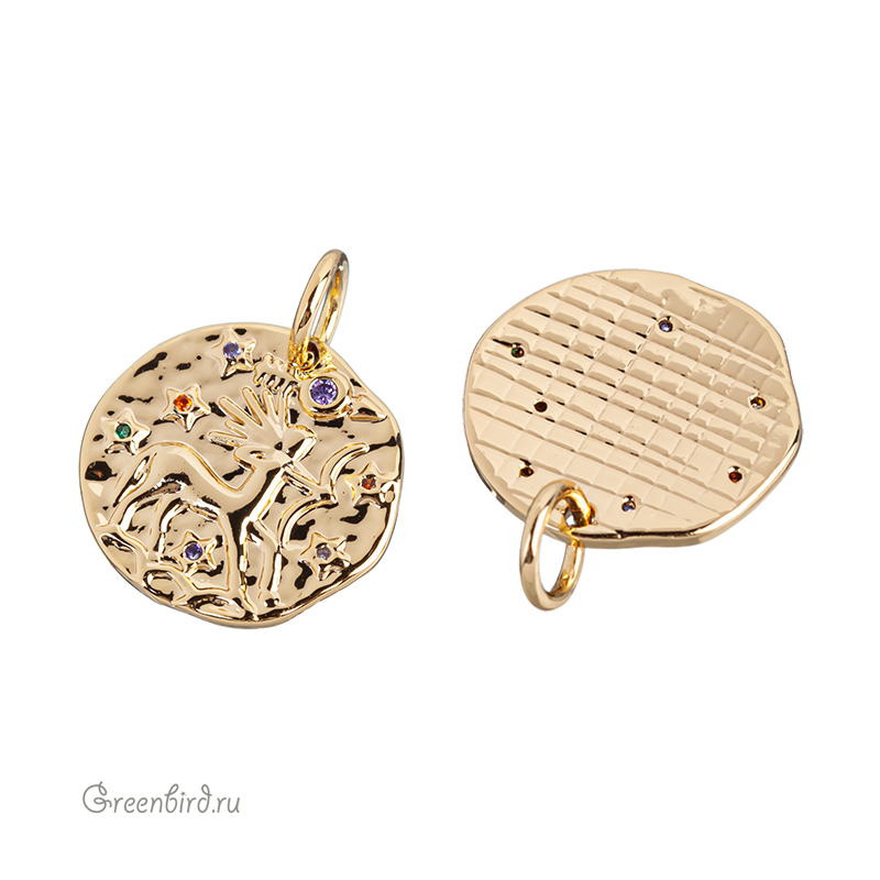 Фурнитура для бижутерии - подвеска односторонняя с зодиакальным символом, украшенная фианитами, с разъемным кольцом. Материал: латунь, покрытие: золото. Цвета фианитов: сиреневый, оранжевый, зеленый, хрусталь. Размер: 15,2 х 14,8 мм, толщина: 1,6 мм, кольцо: 5,8 мм, толщина проволоки: 0,9 мм, общая высота: 19 мм. Обратите внимание: в зависимости от партии покрытие может быть глянцевым или более матовым. Возможны наплывы покрытия на фианиты. Производство: Китай. Цена указана за 1 шт.