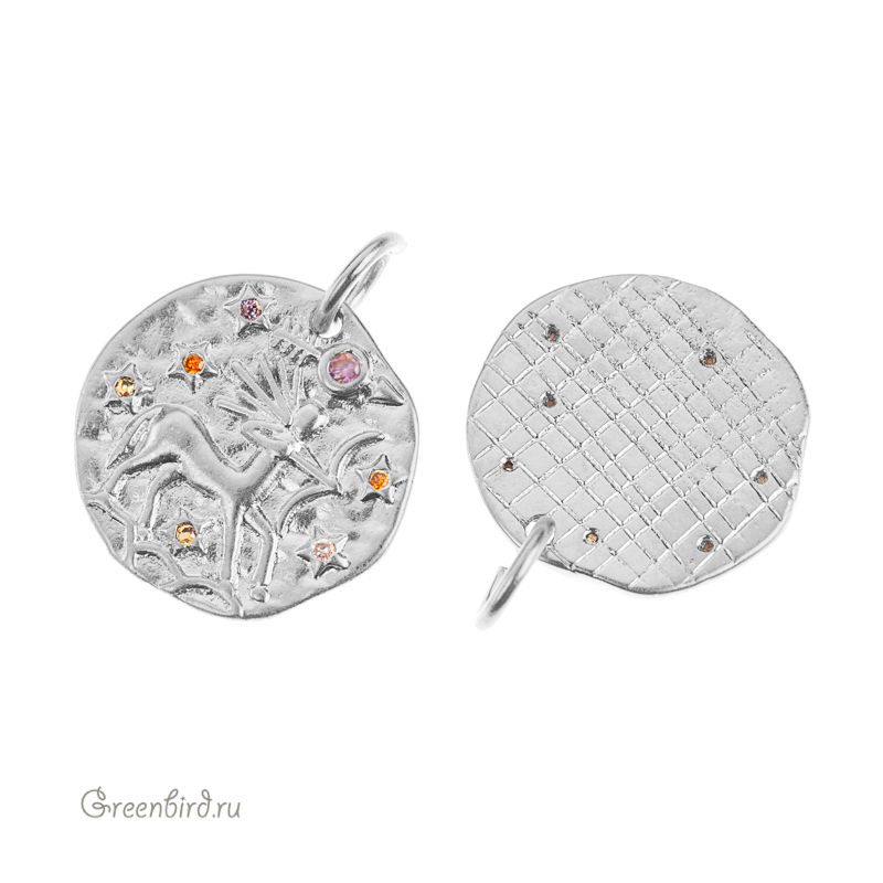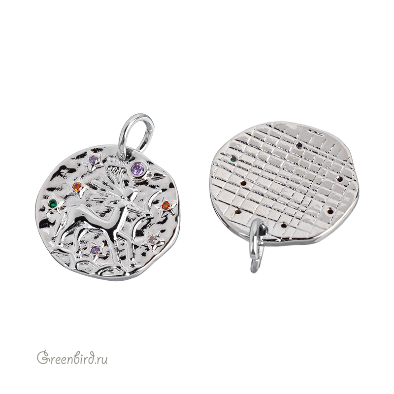 Фурнитура для бижутерии - подвеска односторонняя с зодиакальным символом, украшенная фианитами, с разъемным кольцом. Материал: латунь, покрытие: родий. Цвета фианитов: сиреневый, оранжевый, зеленый, хрусталь. Размер: 15,2 х 14,8 мм, толщина: 1,6 мм, кольцо: 5,8 мм, толщина проволоки: 0,9 мм, общая высота: 19 мм. Обратите внимание: в зависимости от партии покрытие может быть глянцевым или более матовым. Возможны наплывы покрытия на фианиты. Производство: Китай. Цена указана за 1 шт.