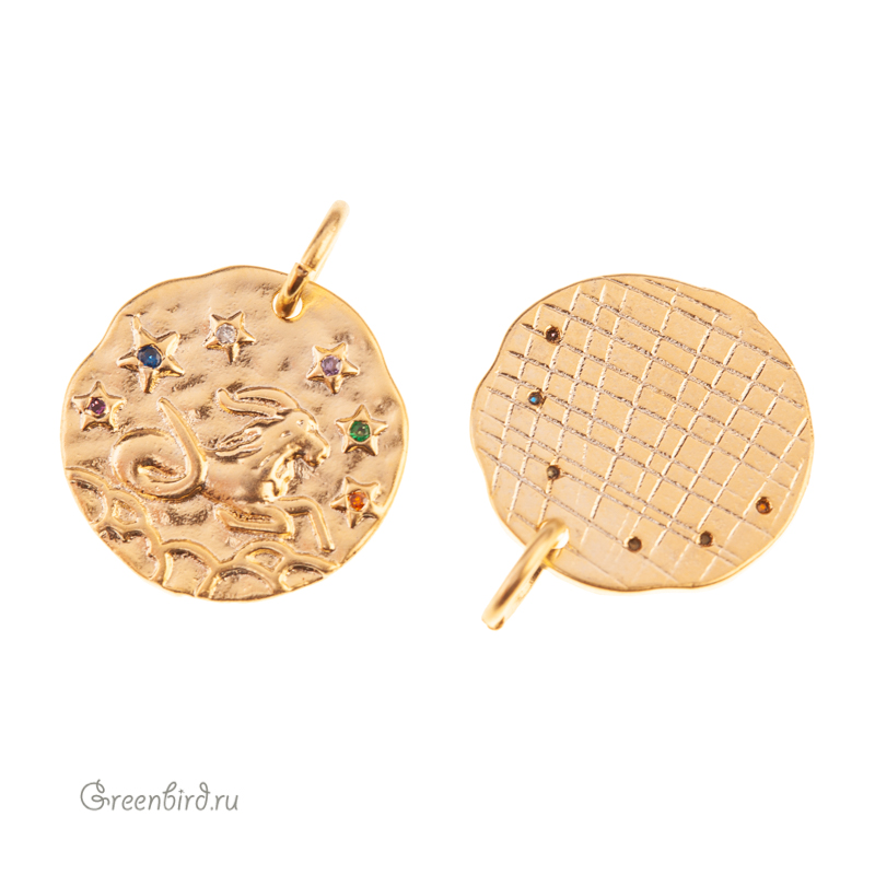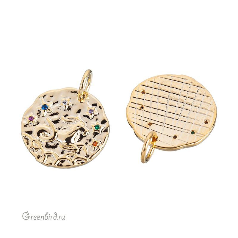 Фурнитура для бижутерии - подвеска односторонняя с зодиакальным символом, украшенная фианитами, с разъемным кольцом. Материал: латунь, покрытие: золото. Цвета фианитов: сиреневый, синий, розовый, оранжевый, зеленый, хрусталь. Размер: 15,1 х 15 мм, толщина: 1,7 мм, кольцо: 5,7 мм, толщина проволоки: 0,9 мм, общая высота: 19 мм. Обратите внимание: в зависимости от партии покрытие может быть глянцевым или более матовым. Возможны наплывы покрытия на фианиты. Производство: Китай. Цена указана за 1 шт.