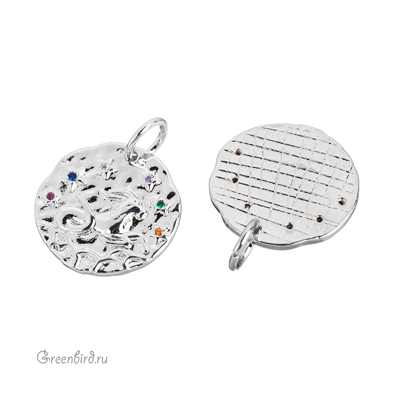 Фурнитура для бижутерии - подвеска односторонняя с зодиакальным символом, украшенная фианитами, с разъемным кольцом. Материал: латунь, покрытие: родий. Цвета фианитов: сиреневый, синий, розовый, оранжевый, зеленый, хрусталь. Размер: 15,1 х 15 мм, толщина: 1,7 мм, кольцо: 5,7 мм, толщина проволоки: 0,9 мм, общая высота: 19 мм. Обратите внимание: в зависимости от партии покрытие может быть глянцевым или более матовым. Возможны наплывы покрытия на фианиты. Производство: Китай. Цена указана за 1 шт.