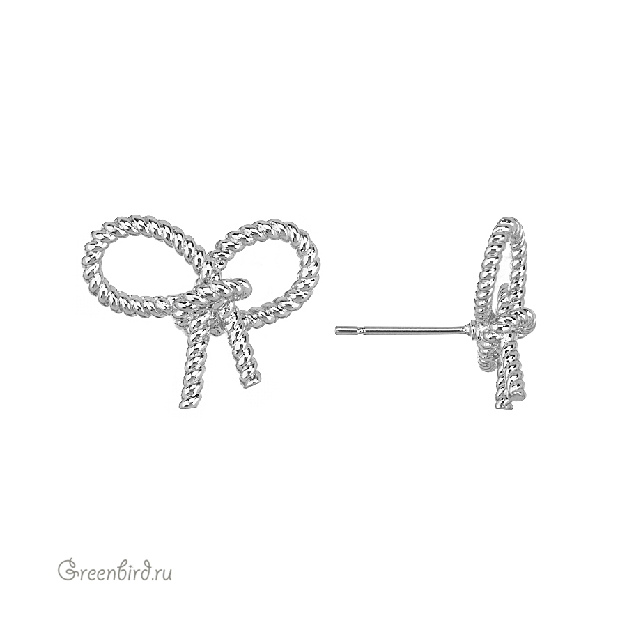Пуссеты в виде бантика из витого шнура. Материал: латунь, покрытие: родий. Размер декоративного элемента: 17 х 15 мм, размер штырька: 10 x 0,7мм. Обратите внимание: заглушки приобретаются отдельно .Производство: Китай. Цена указана за пару.