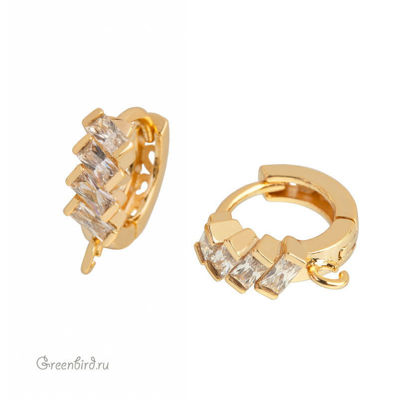 Фурнитура для бижутерии - круглые швензы с фианитами. Материал: латунь, покрытие: золото. Форма огранки фианитов: принцесса (прямоугольник). Размер декоративного элемента: 5 х 11,5 мм, высота швензы с петелькой: 14 мм, толщина дужки: 1,1 мм. Обратите внимание: швензы не зеркальные, в зависимости от партии направление декоративных элементов может отличаться (см. фото).