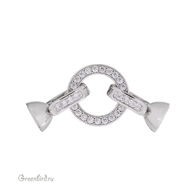 Фурнитура для бижутерии - замок часовой с фианитами в виде неразъемного кольца с двумя застежками. Застежки снабжены колпачками с внутренней перегородкой под нити, шнуры или жгуты. Кольцо имеет отверстия для крепления нитей, также может использоваться отдельно как пришивной элемент. Материал: латунь, покрытие: родий. Общий размер: 36 х 14,5 х 7,5 мм; кольцо: 14,5 мм (внутренний диаметр: 9,4 мм), отверстия: 0,9 х 4,2 мм; размер застегивающейся части (клипсы-крючка) с колпачком: 14,4 х 7,5 мм, максимальный внутренний диаметр колпачков: 5,9 мм. Производство: Китай. Цена указана за 1 шт.
