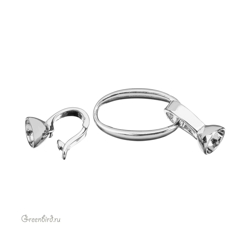 Фурнитура для бижутерии - замок часовой в виде неразъемного кольца с двумя застежками. Застежки снабжены колпачками с внутренней перегородкой под нити, шнуры или жгуты. Материал: латунь, покрытие: родий. Общий размер: 44,5 х 13,4 х 7,5 мм, кольцо: 21,1 х 13,4 мм, размер застегивающейся части (клипсы-крючка) с колпачком: 14,4 х 7,5 мм, максимальный внутренний диаметр колпачков: 5,9 мм. Производство: Китай. Цена указана за 1 шт.