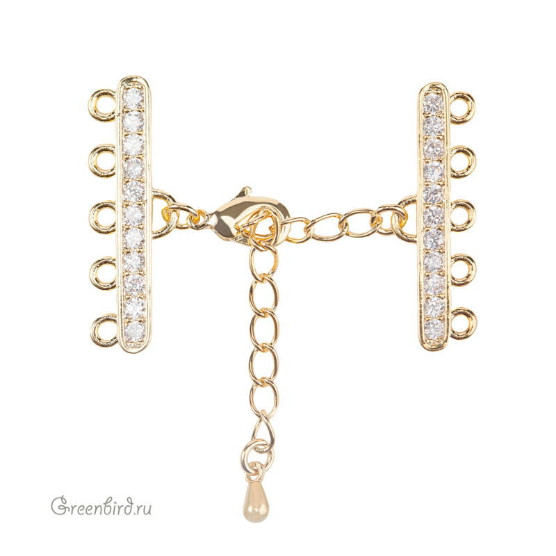 Фурнитура для бижутерии - замок-лобстер с удлинителем и двумя коннекторами на пять петель, с одной стороны украшенными фианитами. Материал: латунь, покрытие: яркое золото. Размер замочка с кольцом: 5 х 11,5 мм, размер коннекторов с петельками: 26 х 8 мм, цепочка удлинителя: 35 мм, подвеска-капелька: 6 мм. Минимальная длина в застегнутом состоянии - 27 мм, максимальная - 58 мм. Производство: Китай. Цена указана за 1 шт.