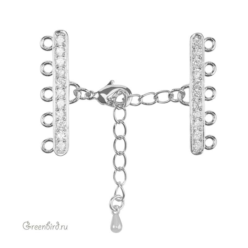 Фурнитура для бижутерии - замок-лобстер с удлинителем и двумя коннекторами на пять петель, с одной стороны украшенными фианитами. Материал: латунь, покрытие: родий. Размер замочка с кольцом: 6 х 14,5 мм, размер коннекторов с петельками: 26 х 8,5 мм, цепочка удлинителя: 50 мм, подвеска-капелька: 6 мм. Минимальная длина в застегнутом состоянии - 35 мм, максимальная - 76 мм. Производство: Китай. Цена указана за 1 шт.