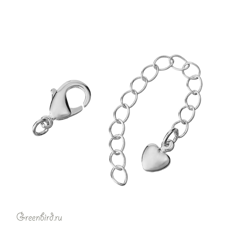 Фурнитура для бижутерии - замок-лобстер с удлинителем в виде сердечка. Материал: латунь; покрытие: родий. Размер замка: 9,6 х 5,3 мм, удлинитель (цепочка): 50 мм, подвеска: 7,6 х 5,6 мм, общая длина с колечками минимум 7 см. Производство: Китай. Цена указана за 1 штуку.