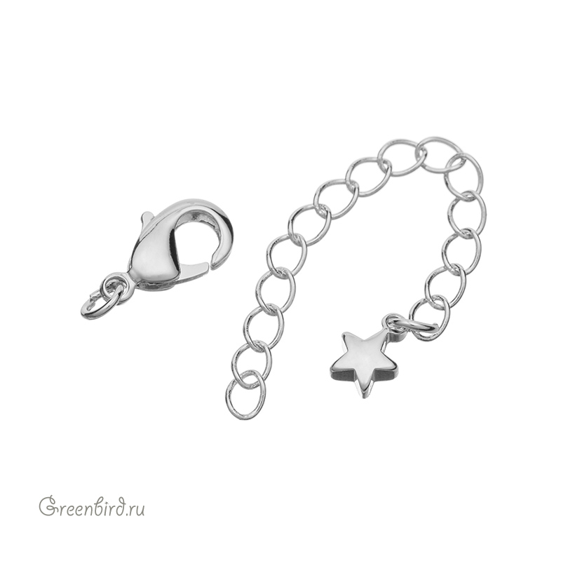 Фурнитура для бижутерии - замок-лобстер с удлинителем в виде звездочки. Материал: латунь; покрытие: родий. Размер замка: 9,6 х 5,3 мм, удлинитель (цепочка): 50 мм, подвеска: 7,5 х 5 мм, общая длина с колечками минимум 7 см. Производство: Китай. Цена указана за 1 штуку.