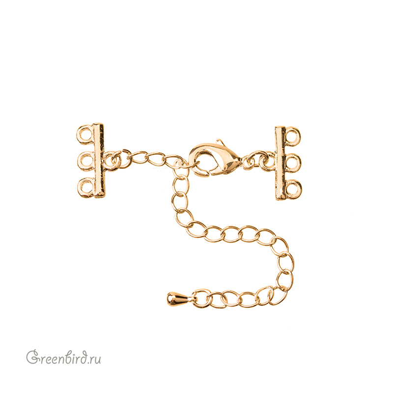 Фурнитура для бижутерии - замок-лобстер с удлинителем и двумя коннекторами на три петли. Материал: латунь, покрытие: золото. Размер замочка с кольцом: 6,7 х 12,3 мм, размер коннекторов с петельками: 14 х 8 мм, цепочка удлинителя: 65 мм, подвеска-капелька: 6 мм. Минимальная длина в застегнутом состоянии - 32 мм, максимальная - 93 мм. Производство: Китай. Цена указана за 1 штуку.