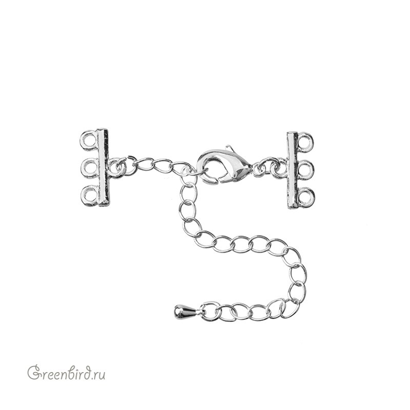 Фурнитура для бижутерии - замок-лобстер с удлинителем и двумя коннекторами на три петли. Материал: латунь, покрытие: родий. Размер замочка с кольцом: 6,7 х 12,3 мм, размер коннекторов с петельками: 14 х 8 мм, цепочка удлинителя: 65 мм, подвеска-капелька: 6 мм. Минимальная длина в застегнутом состоянии - 32 мм, максимальная - 93 мм. Производство: Китай. Цена указана за 1 штуку.