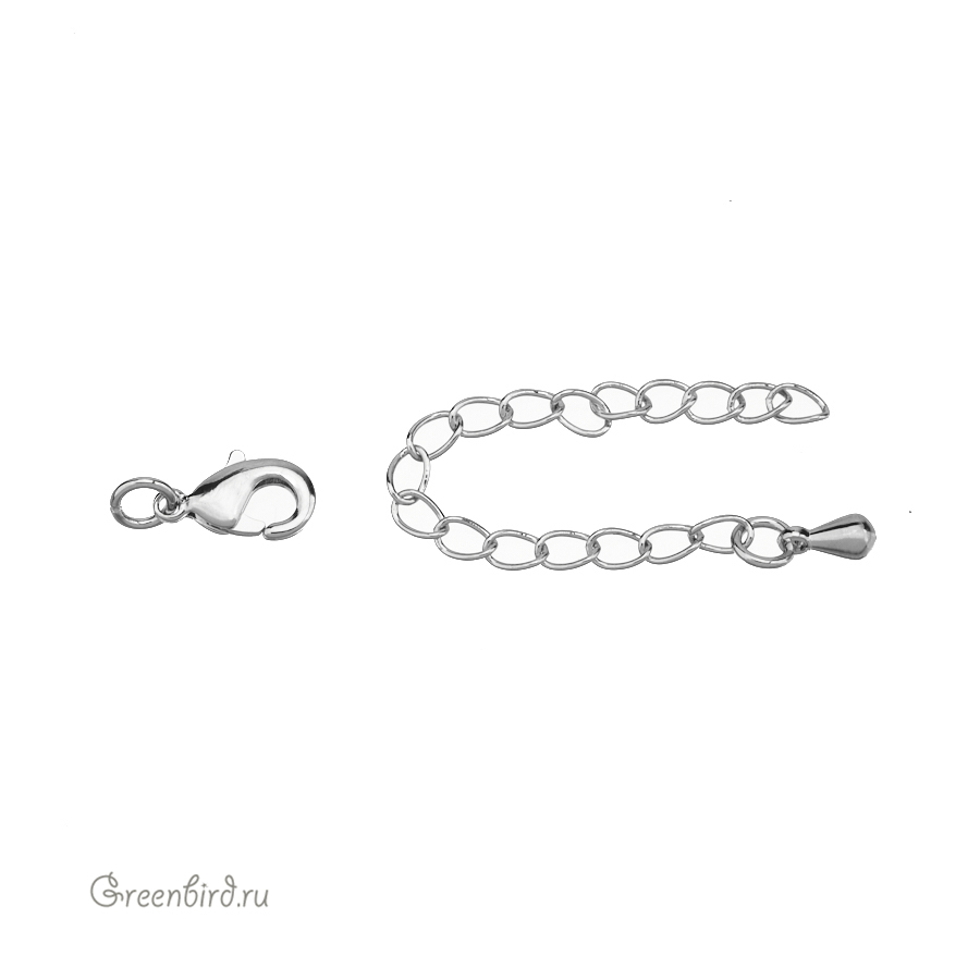 Фурнитура для бижутерии - замок-лобстер с удлинителем в виде капельки. Материал: латунь; покрытие: родий. Размер замка: 10 х 5,3 мм, удлинитель (цепочка): 50 мм, подвеска: 5,3 х 3 мм, общая длина с колечками минимум 5,5 см. Производство: Китай. Цена указана за 1 штуку.