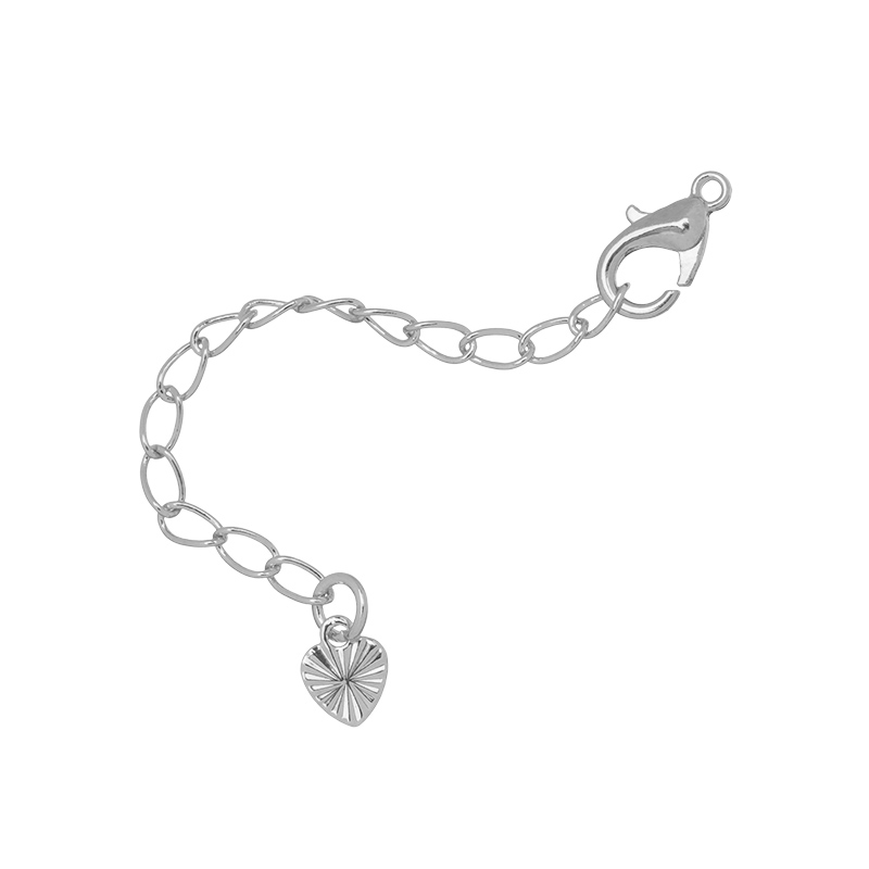 Фурнитура для бижутерии - замочек-лобстер с удлинительной цепочкой и плоской подвеской в форме сердца. Материал: латунь, цвет металла: родий. Размер замочка: 6 x 10 мм, цепочка: 50 мм, размер подвески: 5 x 6.5 x 0.5 мм. Производство: Китай. Цена указана за 1 штуку.