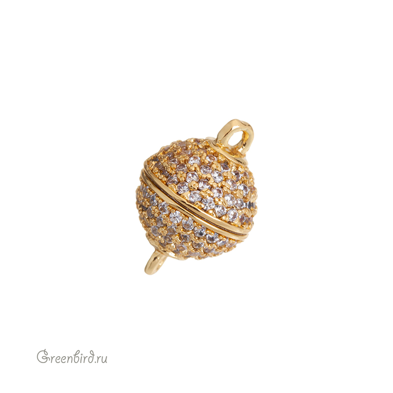 Корейская фурнитура для бижутерии - магнитный замок в форме шара с фианитами. Материал: латунь, покрытие: золото. Диаметр шара: 10 мм, размер с петельками: 14 мм. Производство: Китай. Цена указана за 1 шт.