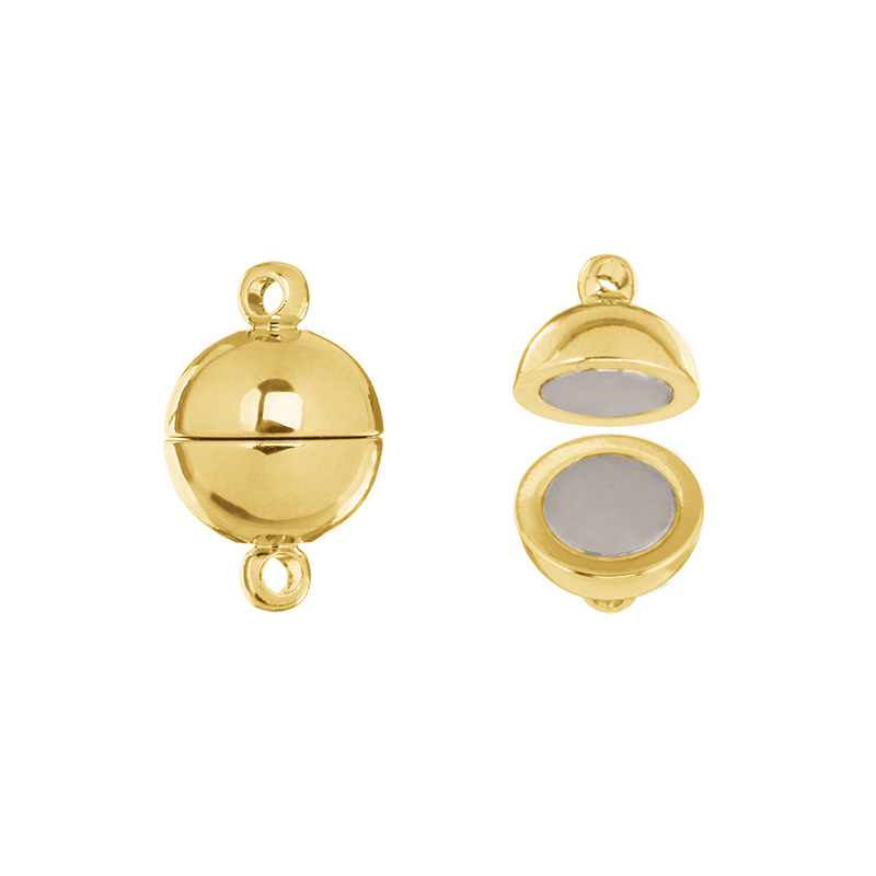 Фурнитура для бижутерии - магнитный замок в форме шара. Материал: латунь, покрытие: золото. Диаметр шара: 10 мм, размер с петельками: 16 мм, внутренний диаметр петелек: 1,6 мм. Производство: Китай. Цена указана за 1 шт.