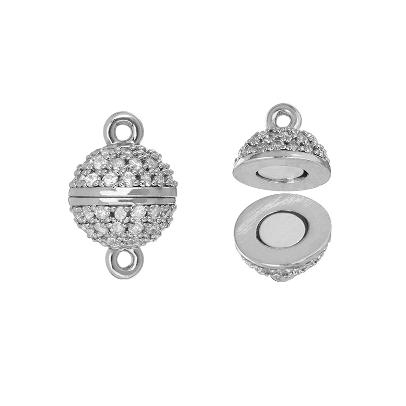 Фурнитура для бижутерии - магнитный замок в форме шара с фианитами. Материал: латунь, покрытие: родий. Диаметр шара: 8,5 мм, размер с петельками: 13 мм, внутренний диаметр петелек: 1 мм. Производство: Китай. Цена указана за 1 шт.