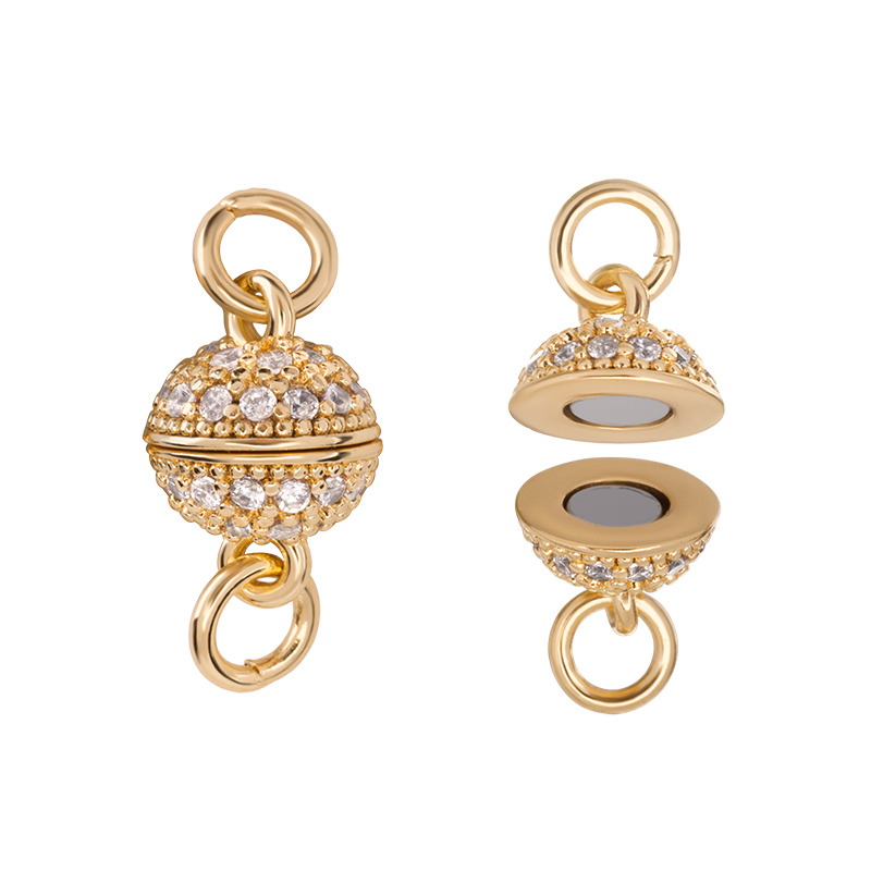Фурнитура для бижутерии - магнитный замок в форме шара с фианитами. Материал: латунь, цвет покрытия: золото. Диаметр шара: 6,5 мм, размер с петельками: 9,3 мм, внутренний диаметр петелек: 1 мм, внешний диаметр соединительных колечек: 4 мм. Производство: Китай. Цена указана за 1 шт.