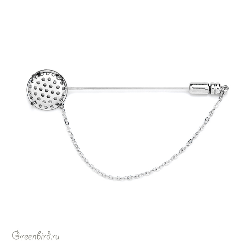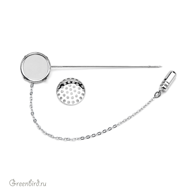 Фурнитура для украшений - шляпная булавка MIYUKI со съемным ситечком, зубцами (крапанами) и завинчивающейся заглушкой на цепочке. Материал: латунь, цвет: серебро. Общая длина в застегнутом виде: 72,5 мм, диаметр рабочей части: 15,1 мм, четыре зубца: 4,8 х 1,8 мм, ситечко: 14 х 2,8 мм, длина иглы: 54 мм, размер заглушки: 11 х 4,5 мм, цепочка: 10,2 см. Производство: Япония. Цена указана за 1 шт.