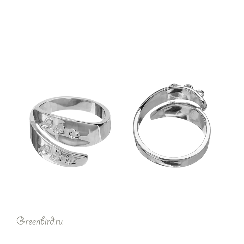 Фурнитура для бижутерии - двойная основа для кольца с шестью неразъёмными петельками. Кольцо позволяет регулировать размер украшения. Материал: латунь, покрытие: родий. Диаметр: 21 мм, ширина в самой широкой части: 14,6 мм, ширина в самой узкой части: 5 мм, толщина: 1,3 мм, диаметр петельки: 1,2 мм. Производство: Китай. Цена указана за 1 шт.