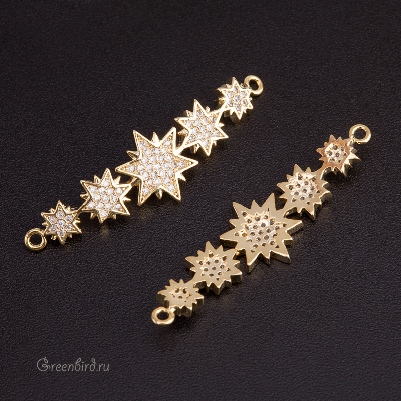 Фурнитура для бижутерии - центральный элемент (коннектор) для браслета в форме неподвижно соединенных звездочек с фианитами, слегка изогнутый, с фронтально ориентированными колечками. Материал: латунь, покрытие: яркое золото. Размер с колечками: 41 х 1,8 мм, внутренний диаметр колечка: 1,5 мм. Производство: Китай. Цена указана за 1 шт.