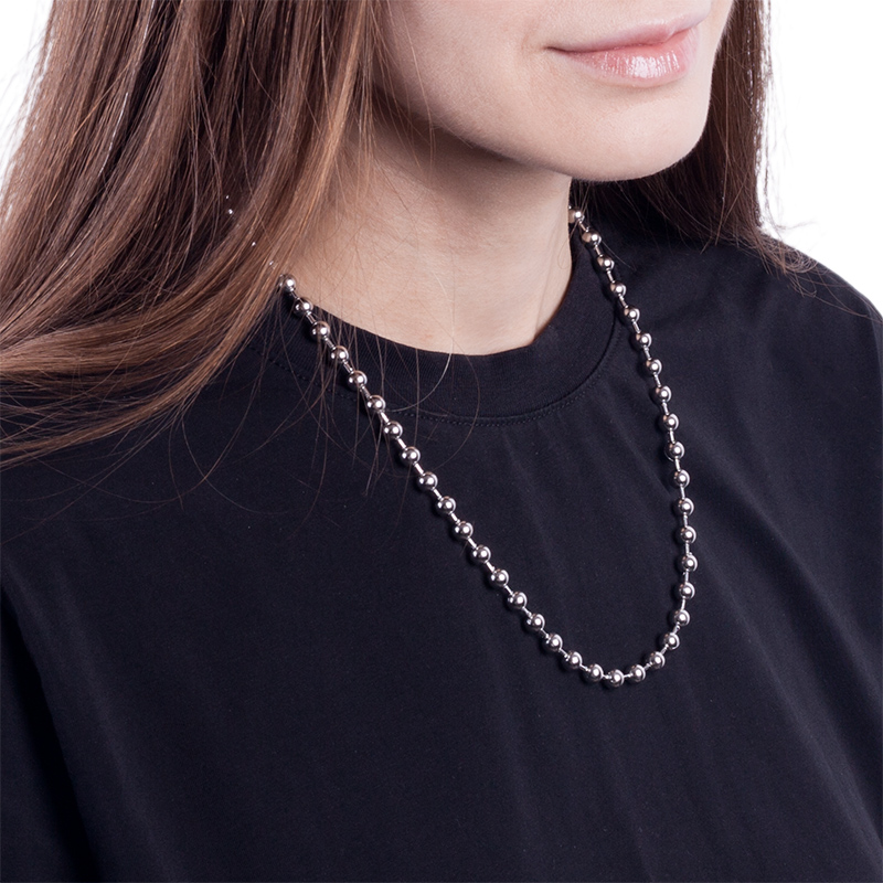 Базовая шариковая цепочка с застежкой — универсальная основа для создания колье. Дополните цепочку подвеской на бейле — и украшение готово. Материал: мет. справ, цвет покрытия: родий. Диаметр шариков: 6 мм; расстояние между шариками в расстянутом состоянии: 2,7 мм. Производство: Китай. Цена указана за цепь 50 ± 0,5 см.