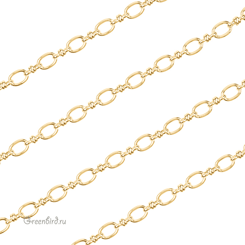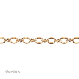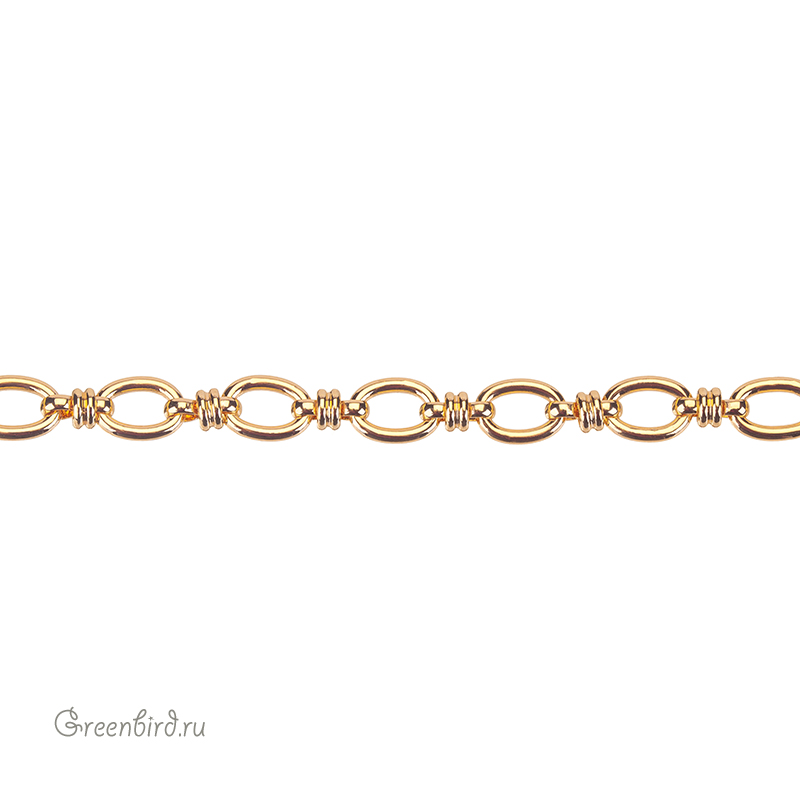 Фурнитура для бижутерии - цепочка фигурная с крупными незапаянными звеньями. Материал: латунь, покрытие: золото. Размер звеньев: 9 х 6.5 мм, толщина звена: 1,5 мм, размер звеньев-сцепок: 9 х 4 мм. Производство: Китай. Цена указана за 30 см. При заказе 2 или 3 единиц этого товара вы получите отрезок длиной 60 или 90 см соответственно.