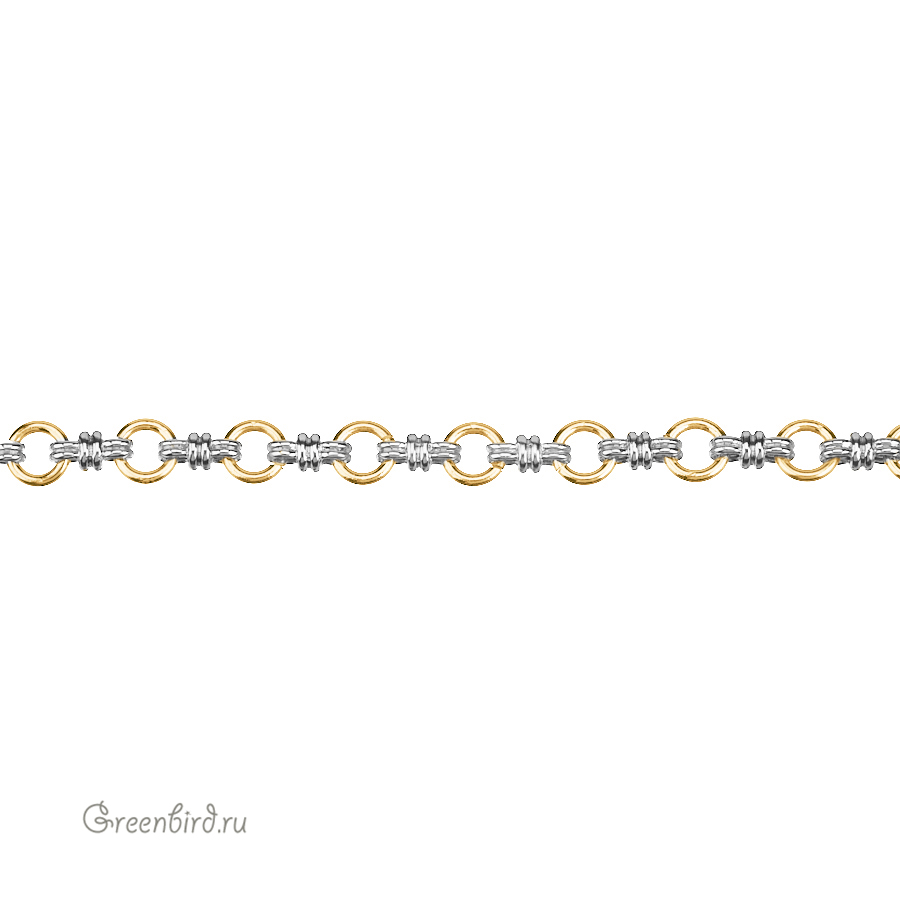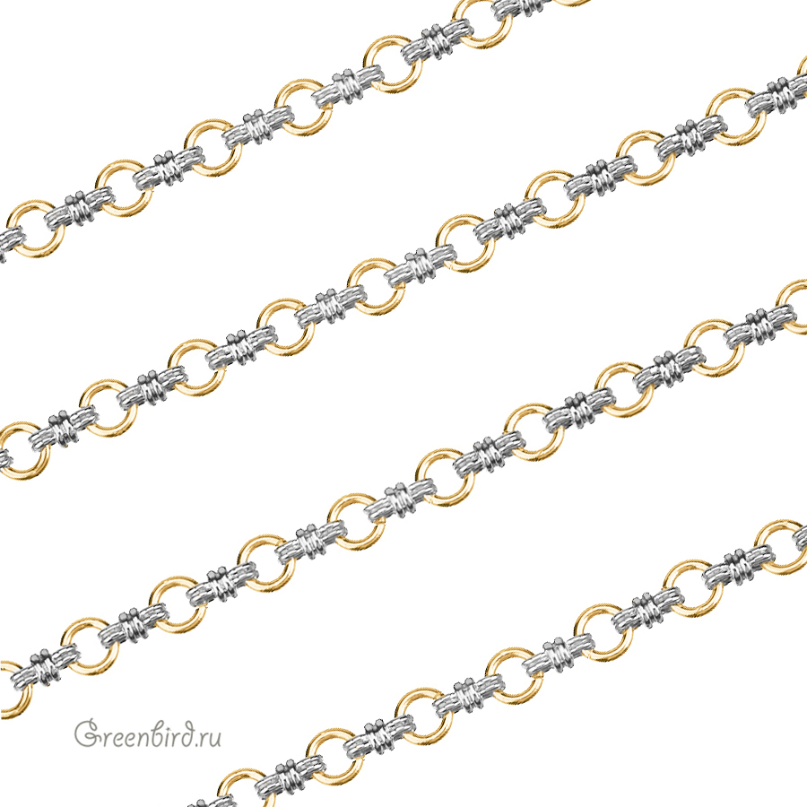 Фурнитура для бижутерии - цепочка фигурная с крупными незапаянными звеньями. Материал: латунь, покрытие: родий / золото. Размер круглых звеньев: 8 х 8 x 1,6 мм, размер звеньев-сцепок: 10 х 5 x 5 мм. Производство: Китай. Цена указана за 30 см. При заказе 2 или 3 единиц этого товара вы получите отрезок длиной 60 или 90 см соответственно.