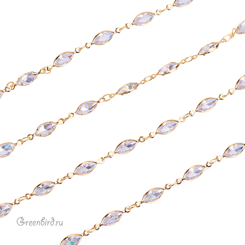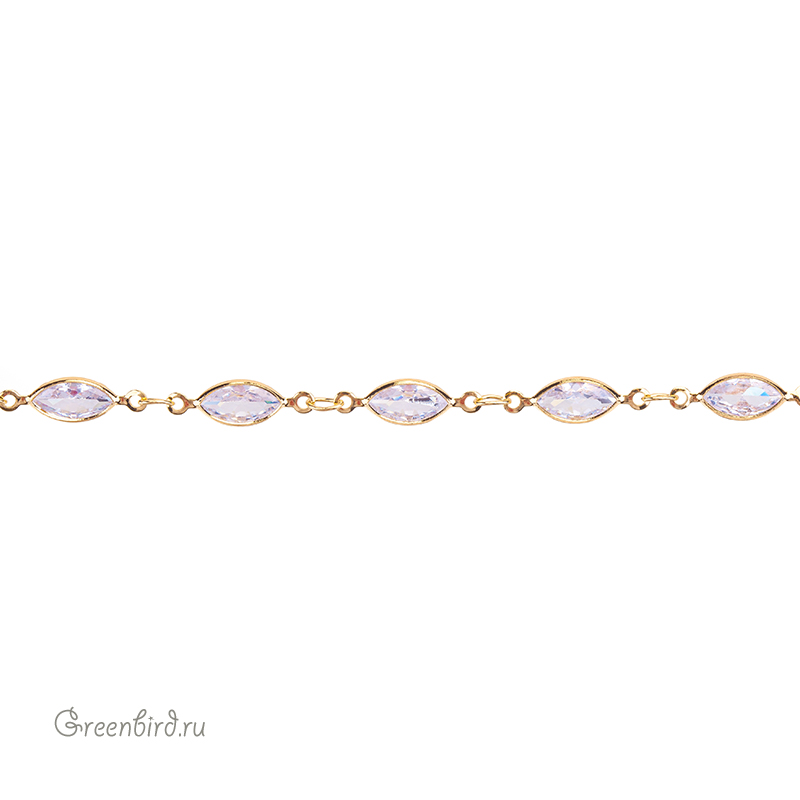 Фурнитура для бижутерии - цепочка декоративная с фианитами в форме лодочки. Материал: латунь, покрытие: золото. Цвет: crystal (прозрачный). Размер элемента-коннектора: 14,3 х 4,5 мм, толщина: 2,3 мм. Размер соединительного колечка: 4,7 х 2,5 мм Производство: Китай. Цена указана за 10 см. При заказе 2 или 3 единиц этого товара вы получите отрезок длиной 20 или 30 см соответственно.