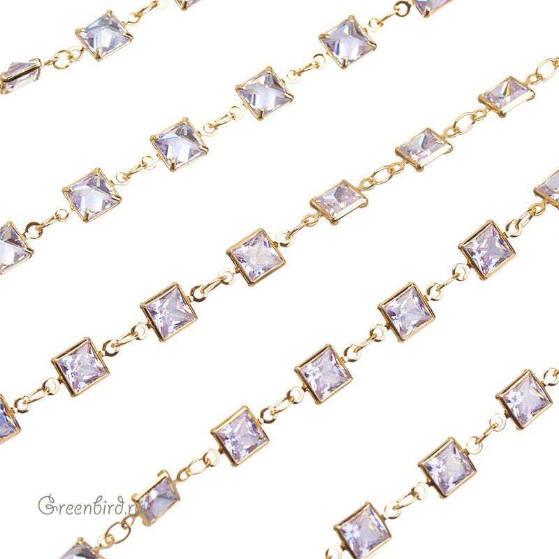 Фурнитура для бижутерии - цепочка декоративная с фианитами в форме квадрата. Материал: латунь, покрытие: золото. Цвет: crystal (прозрачный). Размер элемента-коннектора: 11 х 5,7 мм, толщина: 3 мм. Размер соединительного колечка: 4,7 х 2,5 мм Производство: Китай. Цена указана за 10 см. При заказе 2 или 3 единиц этого товара вы получите отрезок длиной 20 или 30 см соответственно.