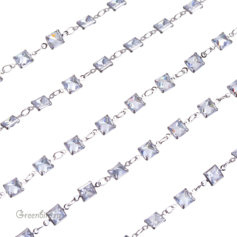 Фурнитура для бижутерии - цепочка декоративная с фианитами в форме квадрата. Материал: латунь, покрытие: родий. Цвет: crystal (прозрачный). Размер элемента-коннектора: 11 х 5,7 мм, толщина: 3 мм. Размер соединительного колечка: 4,7 х 2,5 мм Производство: Китай. Цена указана за 10 см. При заказе 2 или 3 единиц этого товара вы получите отрезок длиной 20 или 30 см соответственно.