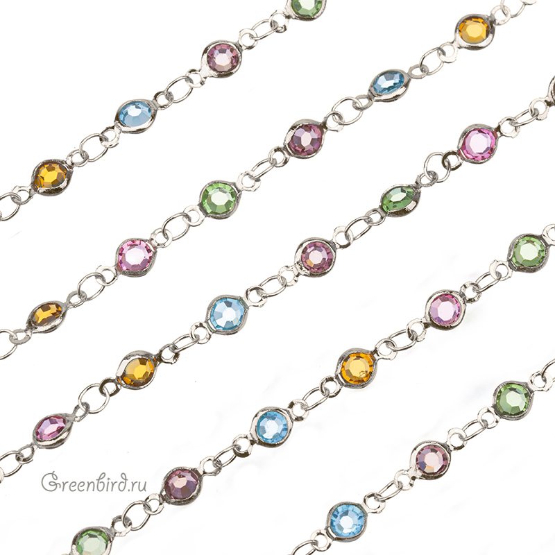 Фурнитура для бижутерии - цепочка декоративная с фианитами различных цветов в форме круглого плоского коннектора. Материал: латунь, покрытие: родий. Размер элемента-коннектора: 10 х 4,6 мм, толщина: 1,9 мм. Размер соединительного колечка: 3,9 х 3,2 мм. Производство: Китай. Цена указана за 10 см. При заказе 2 или 3 единиц этого товара вы получите отрезок длиной 20 или 30 см соответственно.