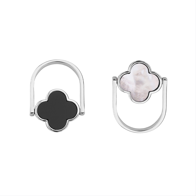 Кольцо двусторонеее (кольцо-перевертыш) с натуральным перламутром и керамикой, в форме клевера (четырехлистника). Размер украшения не регулируется. Материал: латунь, покрытие: родий. Цвет вставки: черный / белый. Рзмер декоративного элемента: 16,5 x 16,5 мм, внутренний диаметр кольца: 17-17,5мм, толщина шинки: 3,5 мм. Производство: Китай. Цена указана за 1 шт.