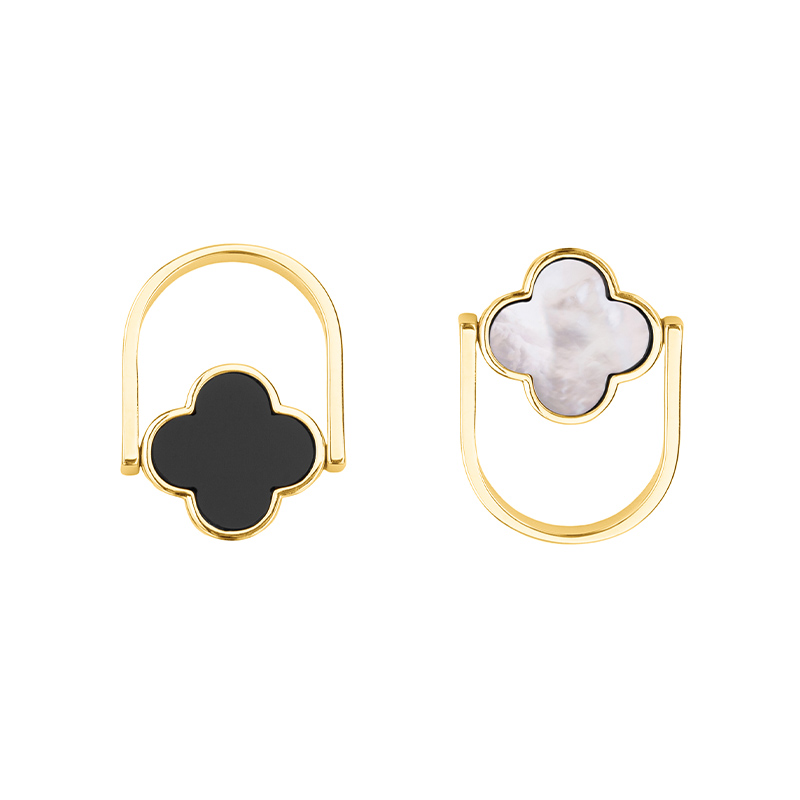 Кольцо двусторонеее (кольцо-перевертыш) с натуральным перламутром и керамикой, в форме клевера (четырехлистника). Размер украшения не регулируется. Материал: латунь, покрытие: золото. Цвет вставки: черный / белый. Рзмер декоративного элемента: 16,5 x 16,5 мм, внутренний диаметр кольца: 17-17,5мм, толщина шинки: 3,5 мм. Производство: Китай. Цена указана за 1 шт.