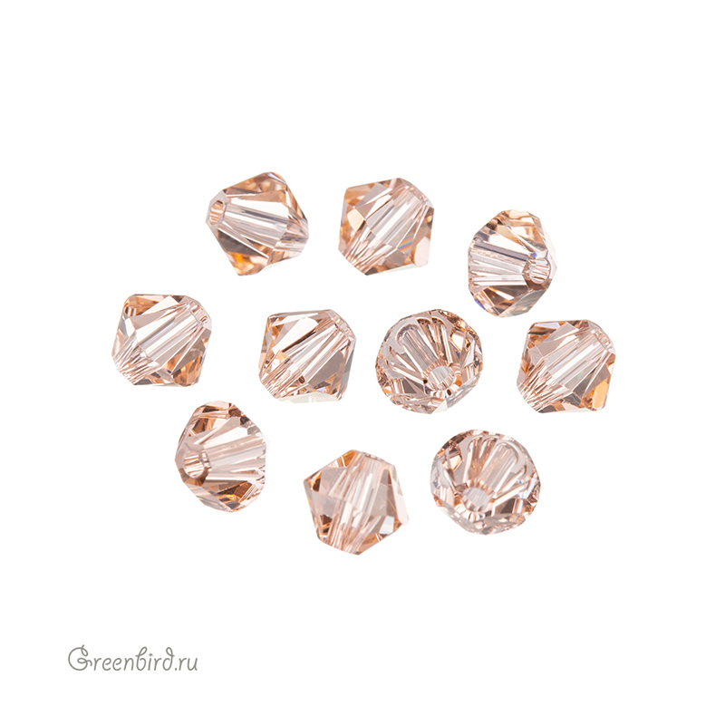 Swarovski 5328 Xilion Bicone Bead — биконусы или двуконусные бусины с фирменной огранкой Xilion. Эта огранка создаёт максимальный блеск за счёт дополнительных фасеток на гранях. Компонент для бижутерии и вышивки. Размер: 5 мм, отверстие: ~0,8-0,9 мм. Цвет: светло-персиковый / Light Peach (#362). Материал: стекло. Производство: Австрия. Цена указана за 10 шт.
