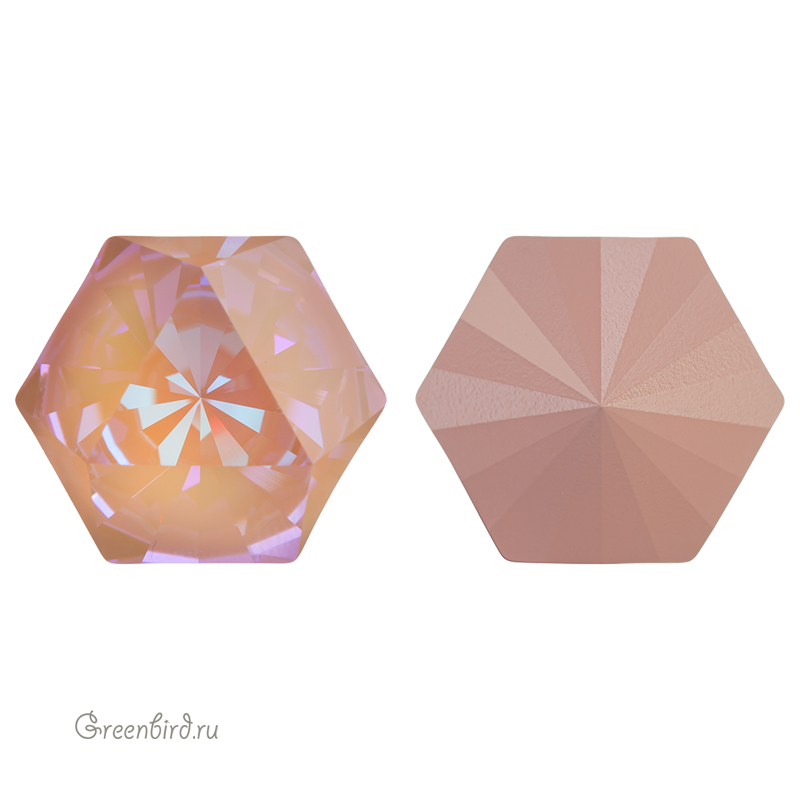 Swarovski 4699 Prismatic Hexagon Fancy Stone — кристалл шестиугольной формы (гексагон) и фантазийной огранкой, создающей эффект призмы. Компонент для бижутерии и вышивки. Размер: 20 х 22,9 мм. Цвет: прозрачный на пыльно-розовой подложке c эффектом делайт без фольги / Dusty Pink DeLite Unfoiled (#001L149D). Материал: стекло. Производство: Австрия. Цена указана за 1 шт.