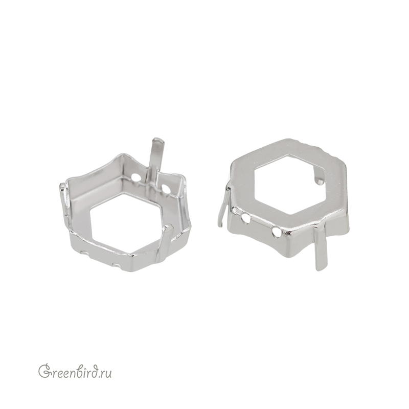 Оправа для ювелирных кристаллов – 4683 Thin Hexagon Fancy Stone. Размер: 14 х 15,8 мм, высота боковой стороны (без лапок): 3,8 мм, отверстия: 1 мм. Материал: томпак (разновидность латуни), покрытие: платина. Производство: Германия. Цена указана за 1 шт.