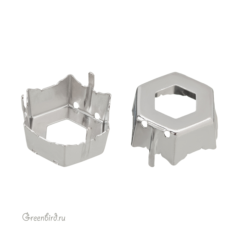 Оправа для ювелирных кристаллов – 4699 Prismatic Hexagon Fancy Stone. Размер: 20 х 22,9 мм, высота боковой стороны (без лапок): 9,7 мм, отверстия: 1,5 мм. Материал: томпак (разновидность латуни), покрытие: платина. Производство: Германия. Цена указана за 1 шт.