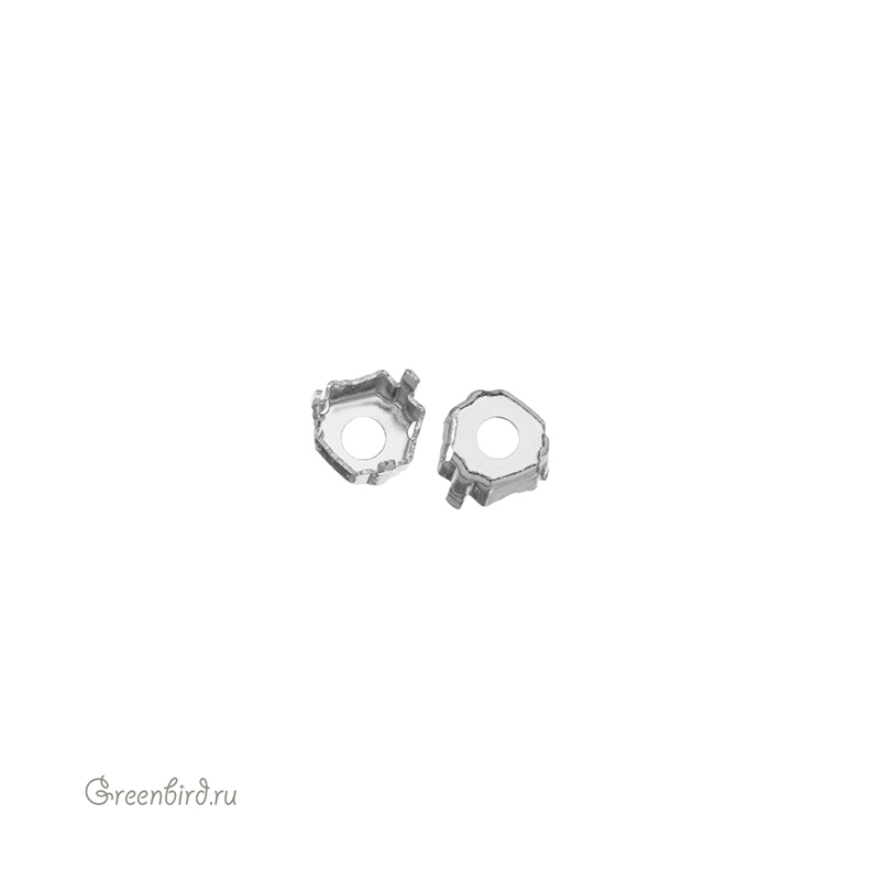Оправа для ювелирных кристаллов – 4699 Prismatic Hexagon Fancy Stone. Размер: 6 х 6,9 мм, высота боковой стороны (без лапок): 3,3 мм, отверстия: 0,6-0,8 мм. Материал: томпак (разновидность латуни), покрытие: белая бронза (white bronze, сплав меди с оловом и цинком). Производство: Германия. Цена указана за 1 шт.