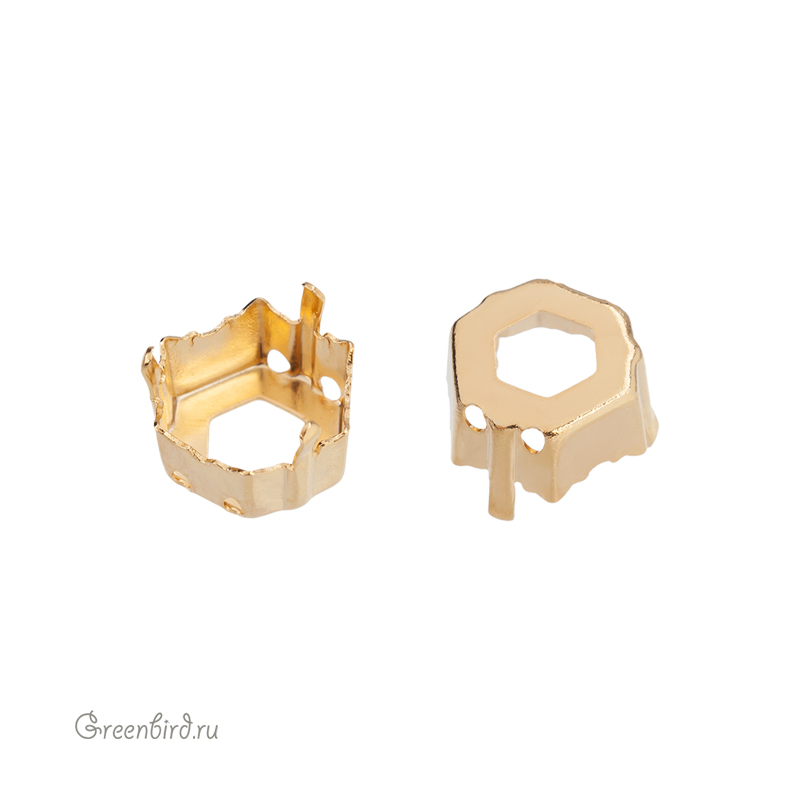 Оправа для ювелирных кристаллов – 4699 Prismatic Hexagon Fancy Stone. Размер: 6 х 6,9 мм, высота боковой стороны (без лапок): 3,3 мм, отверстия: 0,6-0,8 мм. Материал: томпак (разновидность латуни), покрытие: золото. Производство: Германия. Цена указана за 1 шт.
