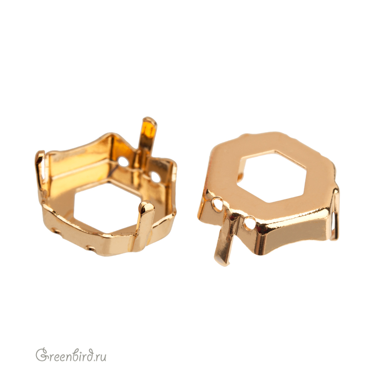 Оправа для кристаллов Swarovski – 4683 Thin Hexagon Fancy Stone. Размер: 12 х 13,5 мм, металл: томпак (разновидность латуни), покрытие: золото. Цена указана за 1 шт.