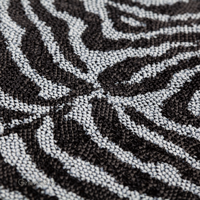 Swarovski 89956 Ultrafine Rocks — кристальная ткань со стразами Swarovski (кристальное полотно). Размер: 200 х 110 мм. Цвет: черный / Jet (#280), принт на кристаллах: #GP23141OP (шкура зебры, печать белым цветом), подложка: черная. Обратите внимание: рисунок не объемный, эффект объема достигается за счет особенностей принта и кристаллов. Материал: стекло, термополотно на силиконовой основе. Производство: Австрия. Цена указана за 1 шт.