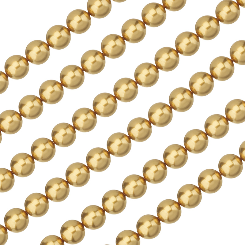 Swarovski 5810 Round — хрустальный круглый жемчуг. Размер: 10 мм, отверстие: 0,9 мм. Цвет: королевский золотой / Royal Gold (#2034). Материал: стекло с инновационным перламутровым покрытием, имитирующим натуральный жемчуг. Производство: Австрия. Цена указана за 10 шт.