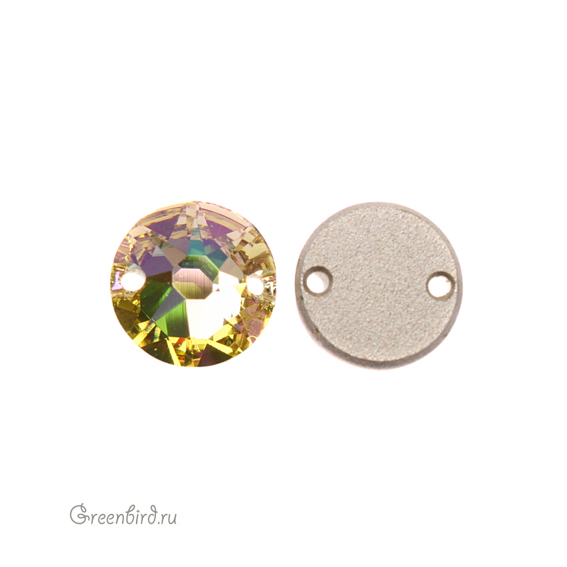 Swarovski 3288 Sew-on Stone – пришивные стразы круглой формы с двумя отверстиями. Размер: 10 мм, отверстие: 0,8 мм. Цвет: прозрачный с эффектом "Люминесцентный зеленый" с фольгированием / Crystal Luminous Green Foiled (#001LUMG). Производство: Австрия. Цена указана за 1 шт.