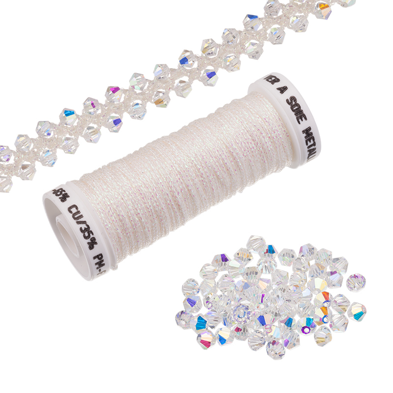 Набор для создания вязаного браслета с биконусами — идеальный выбор для тех, кто любит изящные украшения с деликатным блеском и хочет попробовать необычную технику вязания с бисером и кристаллами.